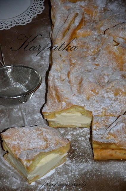 Dziś zaległy przepis na karpatkę. Klasyka wśród ciast, każdemu dobrze znane, choć trochę już zapomniane. Ciasto parzone przełożone kremem budyniowym swojej roboty. Bardzo dobry kremik na bazie żółtek, przez co jest bardziej aksamitny, niż ten na budyniach w proszku.